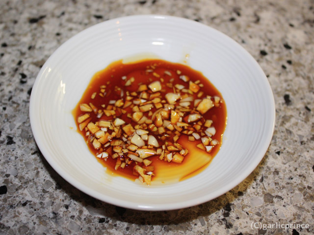 ・醤油に切ったにんにくを入れてできあがり。お好みでゴマ油を垂らすとさらに香りが広がります。