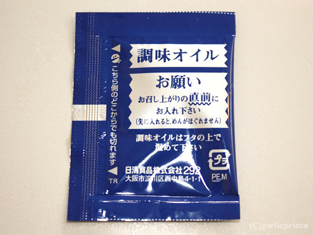 中に「調味オイル」が入っています。これがおそらくガーリックオイルなのでしょう。先に入れないように注意しましょう。